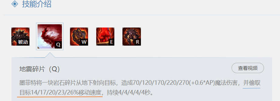 Q技能(地震碎片):石头人将一块岩石碎片从地下射向目标,造成魔法伤害,此技能拥有0.6的AP加成,并偷取目标一定的移动速度,此技能伤害还是可观的,并且距离也是很远的,此技能的优缺点: