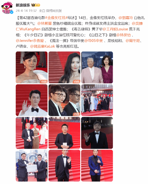 新浪娱乐消息,4月14日,金像奖红毯举办,@劉嘉玲 白色礼服优雅大气;@林熙蕾 黑色纱裙端庄优雅;终身成就奖得主洪金宝出席;@吳慷仁WuKangRen 白西装绅士儒雅;《毒舌律师》黄子华@王丹妮Louise 携手亮相;《年少日记》剧组小主演红毯可爱比心;《白日之下》剧组@林保怡 、@Jennifer余香凝 、《孤注一掷》导演申奥@导05申奥 、是枝裕和、@爾冬陞、卢镇业、@錢嘉樂KaLok 等也亮相红毯。