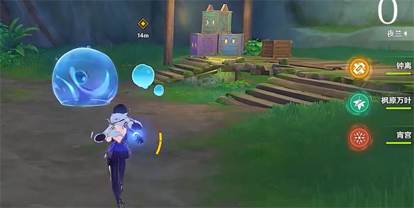 3、跟着任务追踪进入山洞中,我们过去和小水珠进行对话,然后我们就会开启一个小解谜,我们上去推送木箱子,然后我们进入映灯中,然后开启下面的宝箱,接着我们爬上右侧的箱子,然后向左边跳,开启宝箱,然后再往右侧的门走出去即可;
