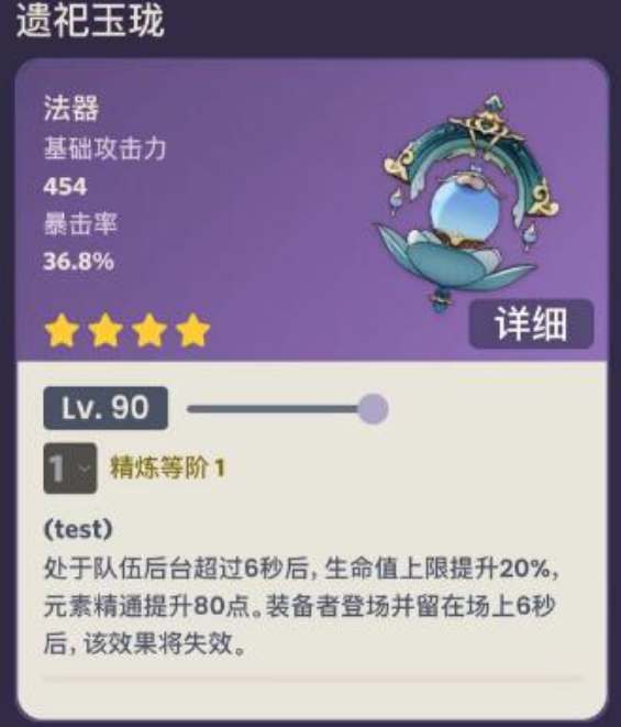1、遗祀玉珑是四星的法器,可以通过4.0版本的纪行获取,这个武器被动效果可以在后台触发,适合速切流阵容。