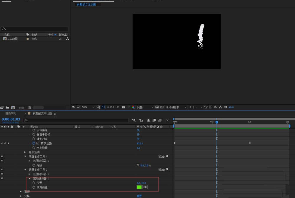 5、接下来还可以通过文本的一些参数进行调整细节,比如分组对齐,设置基线偏移等;再动画里添加位置属性,再添加摆动,改变位置参数, 范围选择器为下斜坡,继续添加填充颜色 rgb,填充颜色就能实现一个颜色拖尾的动画了。