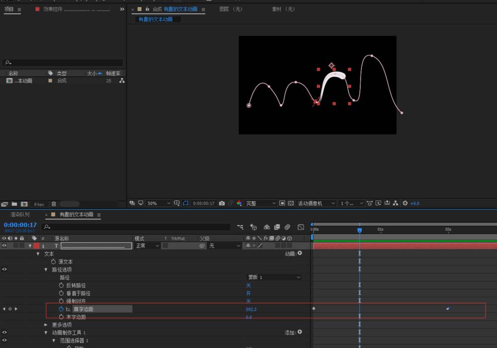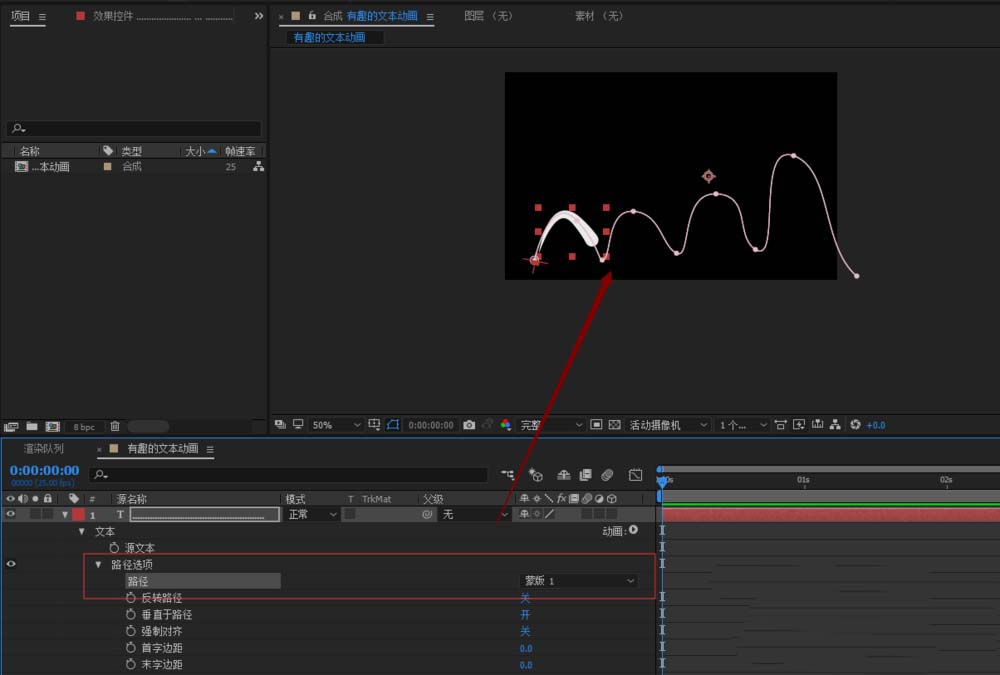 4、选中文本图层 选择钢笔工具绘制好路线,然后调整好的路径曲线,把文本的路径选成我们建立好的蒙版;通过调整首字边距k帧来实现动画;