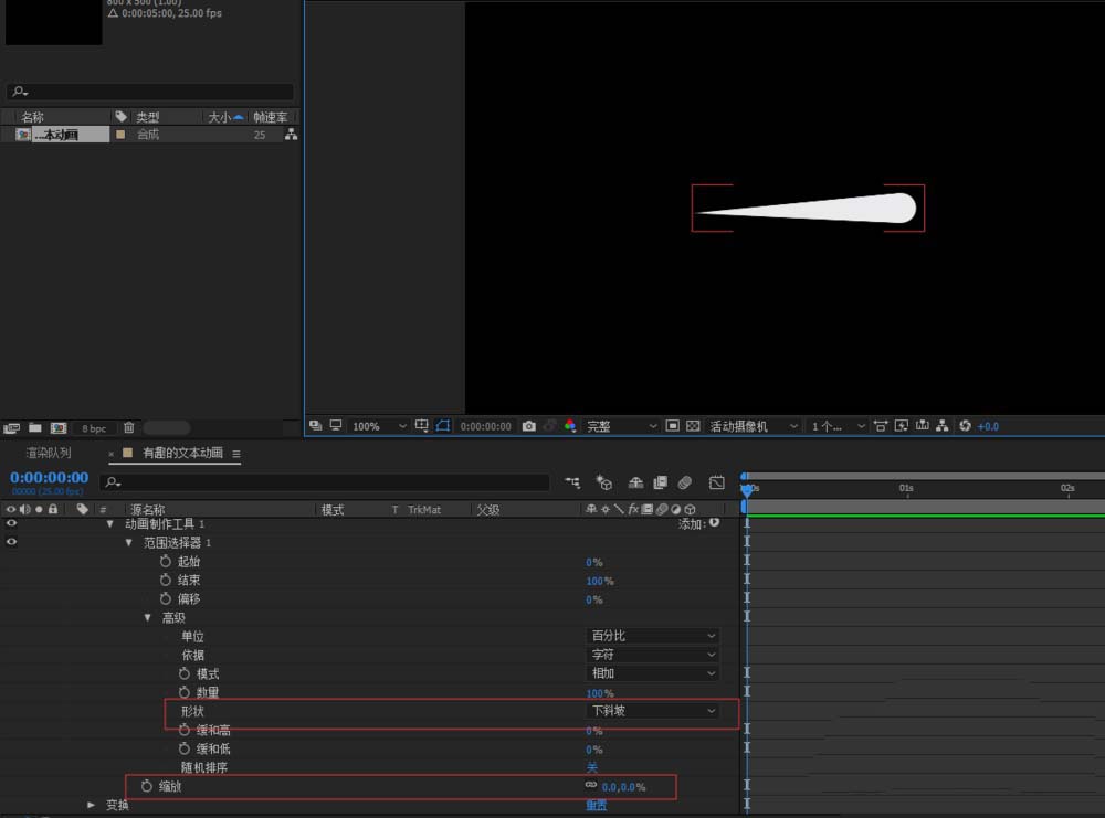 3、通过调整字符间距,形成点成线;然后动画那边添加缩放属性;将缩放数值调整为0;范围选择器里的高级:将形状选择为下斜坡,这样直线变成了锥形;