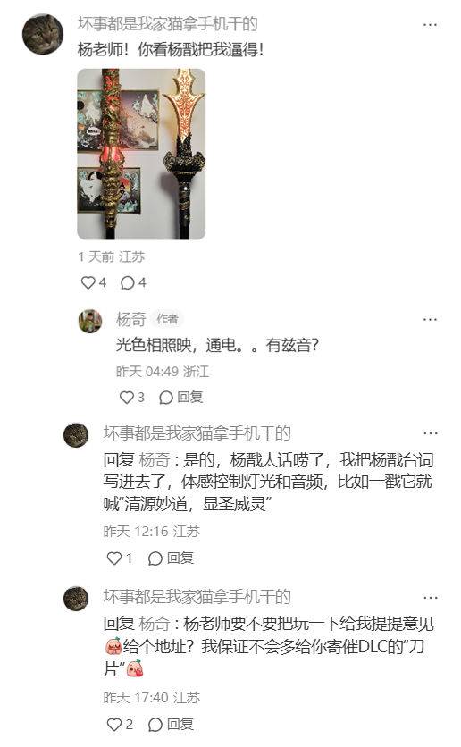 随后,这张图片吸引来了《黑神话:悟空》美术总监杨奇,杨奇回复道:“光色相照映,通电。。有兹音?”这位小红书网友则表示,三尖两刃枪不但能发光,还能够发出声音:“我把杨戬台词写进去了,体感控制灯光和音频,比如一戳它就喊‘清源妙道,显圣威灵’。”