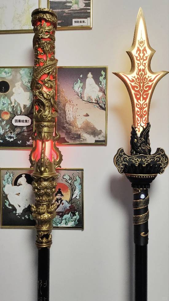 在《黑神话:悟空》里,如意金箍棒和三尖两刃枪可谓是较为重磅的兵器。日前,小红书网友“坏事都是我家猫拿手机干的”发布了一张自制的如意金箍棒和三尖两刃枪展示图片,细节十分出色且非常精致,说道:“杨老师!你看杨戬把我逼得!”一起来看下。