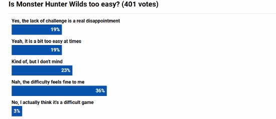 截至发稿前,共有401人参与投票。有19%的玩家认为缺乏挑战性,令人失望;有19%的玩家认为有些太容易;有23%玩家认为简单但能接受;有36%的玩家认为难度恰好,很适合自己;只有3%的玩家认为难度较高。