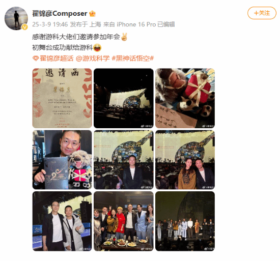 者来女:“(在)游戏科学年会现场终于见到儒雅至尊的冯骥先森~呀~黑神话悟空的戒指收到、开心的原地爆炸,请老天爷善待置心一处又耐心做事的人,弄堂小馄饨汤汤水水哦豁~上海下点子小雨散步回酒店也哦豁~ 祝所有主创大家都吉祥如意、美好如初。”