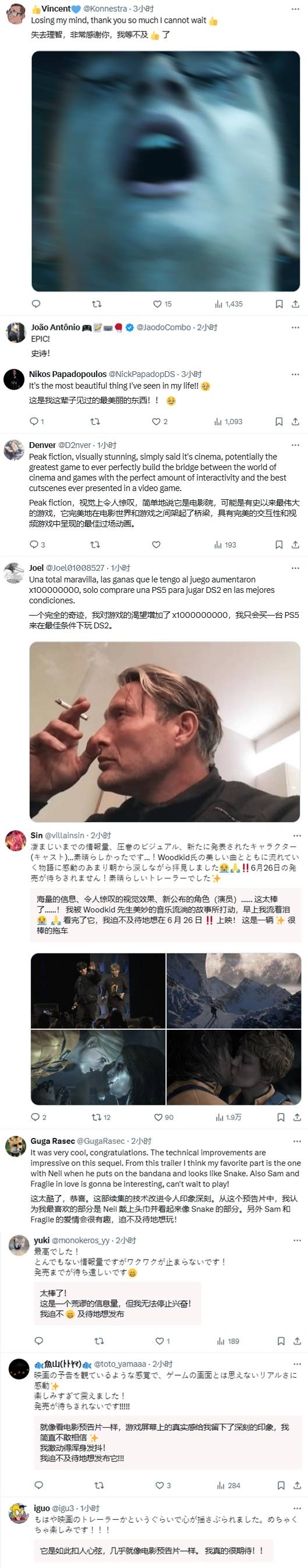 小岛秀夫本人也是随后在X上发文询问玩家们的感受:“您觉得《死亡搁浅2》的预告片如何?”