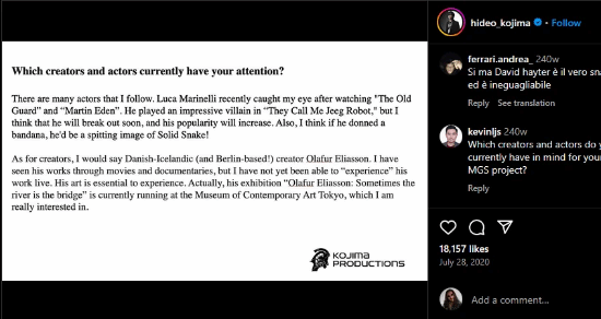 不过,有外网玩家注意到:这显然是小岛秀夫当年的一次伏笔回收。在2020年的个人Ins上,小岛秀夫就曾表示非常欣赏卢卡·马里内利,并且认为他如果系上头带就和索利得几乎一模一样。
