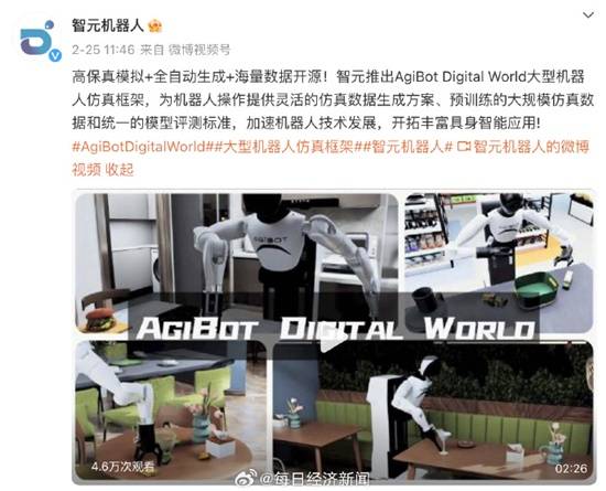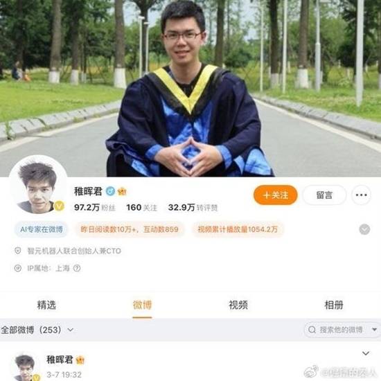 3月7日,智元机器人(AgiBot)联合创始人稚晖君(彭志辉)在微博上预告,“下周智元机器人有好东西发布 ”。数据显示,其微博昨日阅读数超过10万,视频累计播放量超过1050万。