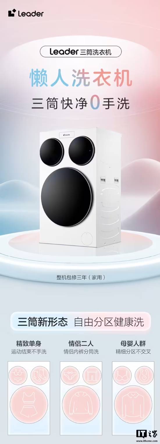 据IT之家报道,海尔集团现已在京东上架“全球首款懒人洗衣机”——“Leader三筒洗衣机(型号为XQGL125-MBLDE697WU1)”,定价为4999元(国补后3999元),现已开启预售,将于4月17日首销。
