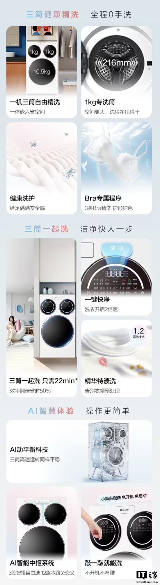 该产品采用10.5kg+1kg+1kg三筒设计,支持三筒同洗,号称22分钟完成洗衣程序。也就是主筒洗常规衣物,两个副筒分别洗短裤袜子等,有点类似洗衣房。