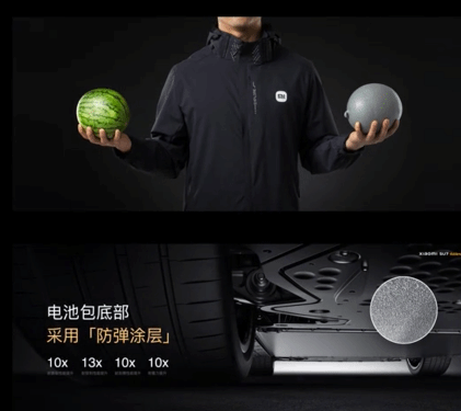 据了解,小米SU7 Ultra的电池包底部就采用了这种“防弹涂层”,可以有效的防止在托底等事故中、因异物冲击、剐蹭造成的电芯损伤。