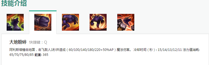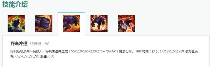 Q技能:牛头的灵魂技能,AOE击飞并且可以打断很多技能,例如盲僧的Q,芮尔的W,小炮的w等等,用Q的时候不一定要站在别人脚下,因为Q是有一定的范围,和石头的R一样。