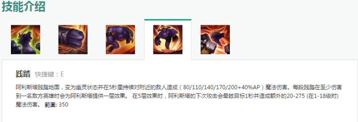 E技能:开启践踏底面,叠满5层效果的时候只要A目标,就会造成眩晕,就算对方位移也能A出来眩晕,一般WQ完开E追击在晕住对面。