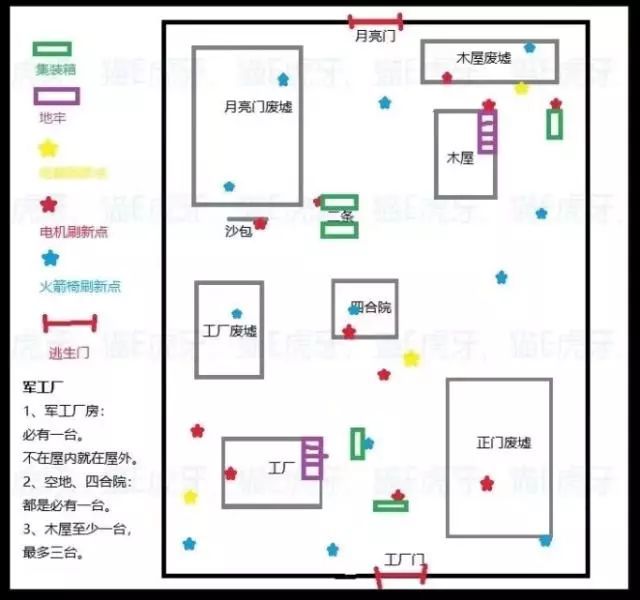军工厂是游戏测试阶段的第一张地图,是厂长的老家,地图内容比较简单,主要建筑是厂房和库房,另外四周的废墟也有一些木板、窗户,可以轻松溜屠夫。