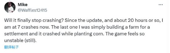 一位推特网友表示:“游戏最终会停止崩溃么?自次世代更新以来,在大约20小时左右的时间里,我经历了7次崩溃。最后一次(崩溃)时我只是在为定居点建造一个农场,游戏在种植玉米的时候崩溃了。游戏(仍然)感觉不稳定。”