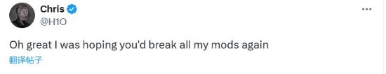 “哦,太好了,我希望你能再次毁掉我所有的mod。”另一位用户在 贝塞斯达宣布新更新后说。