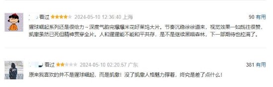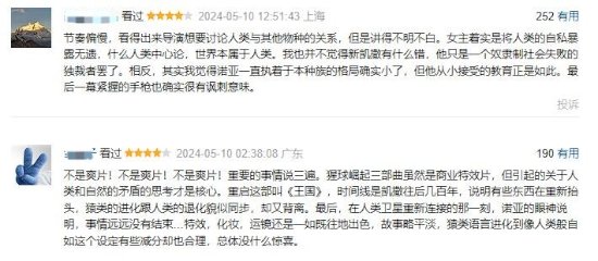 获得高赞的短评表示,本片节奏偏慢,并非爽片,虽是商业特效片,特效方面出色,但主旨主要探讨的却是人类和自然的矛盾。剧情方面平淡,整体而言并无太多惊喜,难免审美疲劳,以至于有观众调侃“80%剧本不是AI写的就是猩猩写的”。