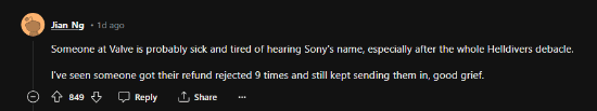 还有玩家吐槽称:“V社的员工们近期估计已经听吐了‘索尼’两个字,尤其是在《地狱潜者2》事件后,我听说有人申请退款被拒绝了九次但依然坚持申请。”