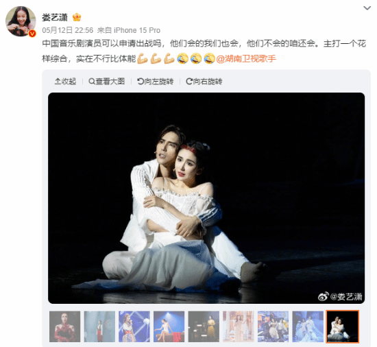 今日,话题“娄艺潇自荐歌手”登顶微博热搜,其在微博表示:中国音乐剧演员可以申请出战吗,他们会的我们也会,他们不会的咱还会。主打一个花样综合,实在不行比体能。