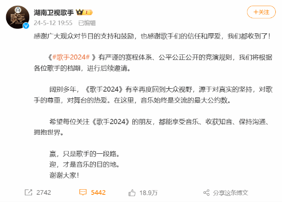 5月12日,湖南卫视《歌手》节目发文回应韩红等人请战,表示:“感谢歌手们的信任和厚爱,我们都收到了!《歌手2024》有严谨的赛程体系、公平公正公开的竞演规则,我们将根据各位歌手的档期,进行后续邀请。”
