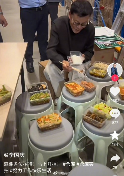 视频显示,李国庆坐在一个包装箱上,手里拿着盒饭,面前的六个凳子上摆放着超过十种不同的菜肴。