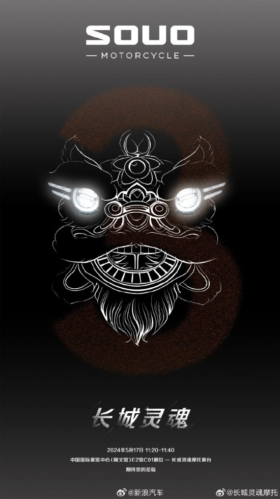 长城汽车官方宣布灵魂摩托品牌将于5月17日在中国国际展览中心(顺义馆)E2馆C01展位正式发布,届时其首款摩托车也将首次亮相。