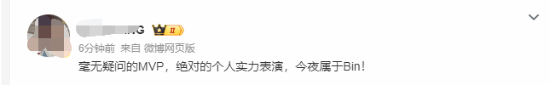 BLG上单选手BIN整场比赛两获MVP,其出色发挥在这场BO5中起到关键作用,赛后“神bin天降”话题登上微博热搜,不少网友称赞其状态火热,并希望可以延续到最终决赛上。