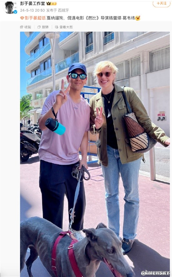彭于晏戛纳遛狗偶遇《芭比》导演 二人合照粉粉嫩嫩