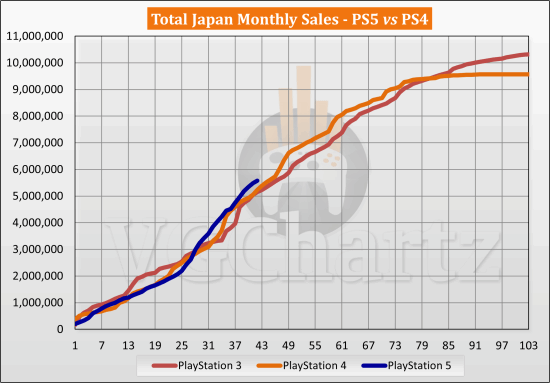 PS5在日本地区的第42个月是2024年4月,而对于PS4来说是2017年7月。在相同的时间范围内,PS5销售了558万台,而PS4销售了524万台。PS4在第45个月销售了与当前PS5销量相当的数量。
