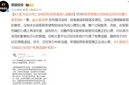 大麦回应出示死亡证明仍拒变更观演人 道歉并免费退票