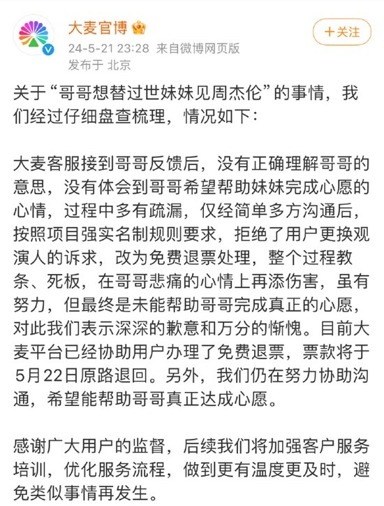 大麦官博发布情况说明,称客服接到哥哥反馈后,没有正确理解哥哥的意思,没有体会到哥哥希望帮助妹妹完成心愿的心情,整个过程教条、死板,在哥哥悲痛的心情上再添伤害,虽有努力,但最终是未能帮助哥哥完成真正的心愿,对此表示深深的歉意和万分的惭愧。