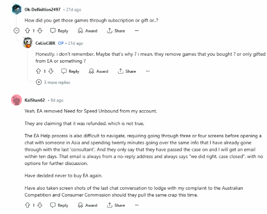 在评论区中,也有一些玩家表示自己遇到了同样的情况,有玩家甚至表示,自己以后不会再买EA的游戏。