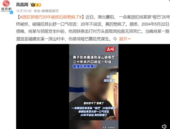 据凤凰网报道,近日,湖北襄阳, 一命案逃犯肖某装“哑巴”20年终被抓,被捕后其长舒一口气坦言:20年不说话,真的憋疯了。