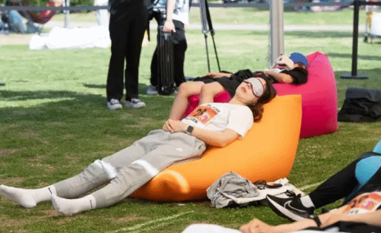 近日,韩国首尔举办了首届“睡觉大赛”。活动当天,近百名参赛者躺在气垫床上睡午觉,身心获得片刻放松。