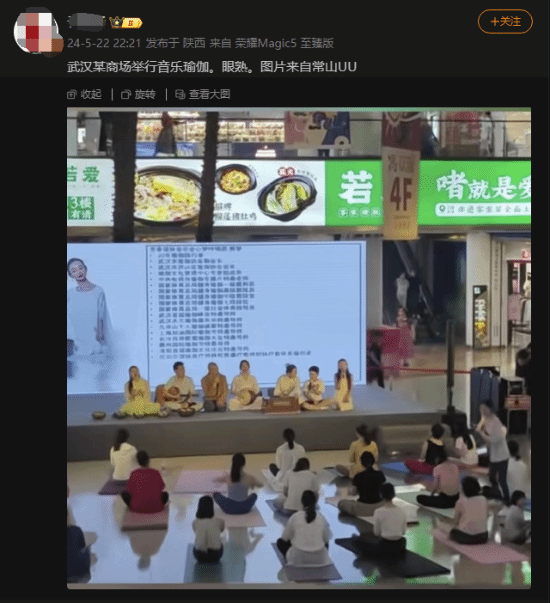 近日,有网友分享了一张武汉某商场举行音乐瑜伽的图片,现场氛围不禁让人联想到电影《周处除三害》中尊者给信徒“洗脑”的场景。