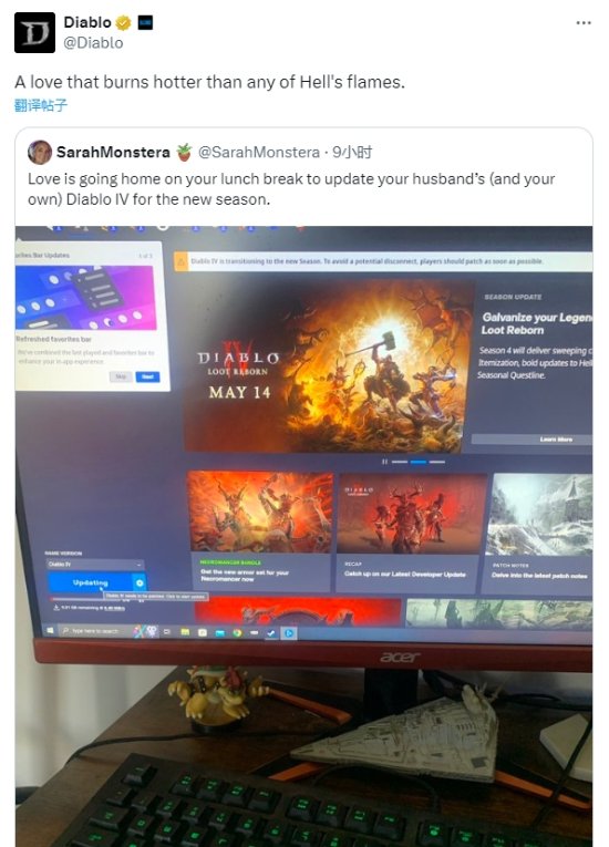 原来是这位妻子趁着自己午休回家,提前为丈夫更新他要玩的《暗黑破坏神4》。官方推特也转发表示:这是比地狱的任何烈焰都要制热的爱。
