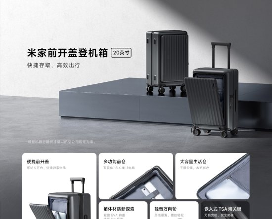 小米推出了新款米家前开盖20英寸登机箱,定价为449元。该款行李箱采用创新的前开盖设计,使箱盖在箱体站立状态下也能轻松开启,便于快速存取物品。