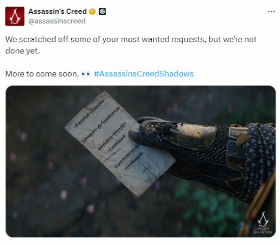 《刺客信条》官方发推称:“我们已完成你们最希望实现的一些要求,但还没全部完成”。配图中的任务清单最后一行是“???”,表示还有一个玩家需求未揭晓。外媒猜测大概率是多人游戏的回归,可能是竞争也可能是合作。