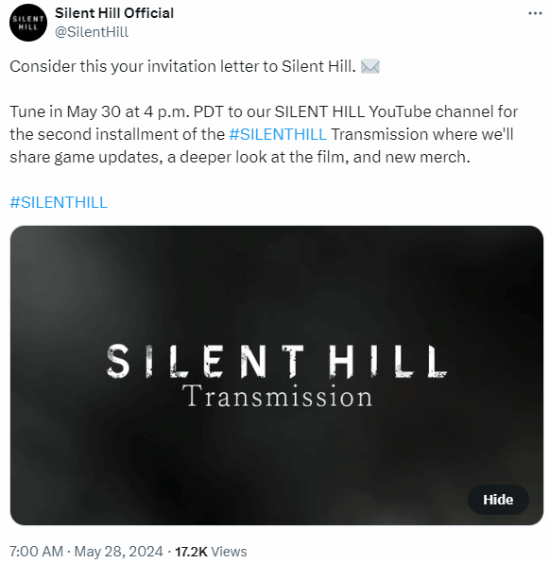 官方宣布,《寂静岭》系列最新情报的节目“SILENT HILL Transmission”将于北京时间5月31日7:00播出。分享《寂静岭》游戏、电影和商品方面的新消息。敬请期待。