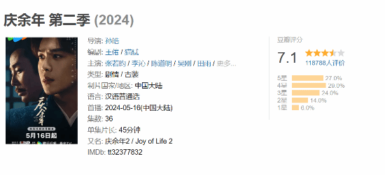 热播剧集《庆余年 第二季》豆瓣评分升至7.1分,目前有超过11万观众参与评分,五星占比高达27.0%。
