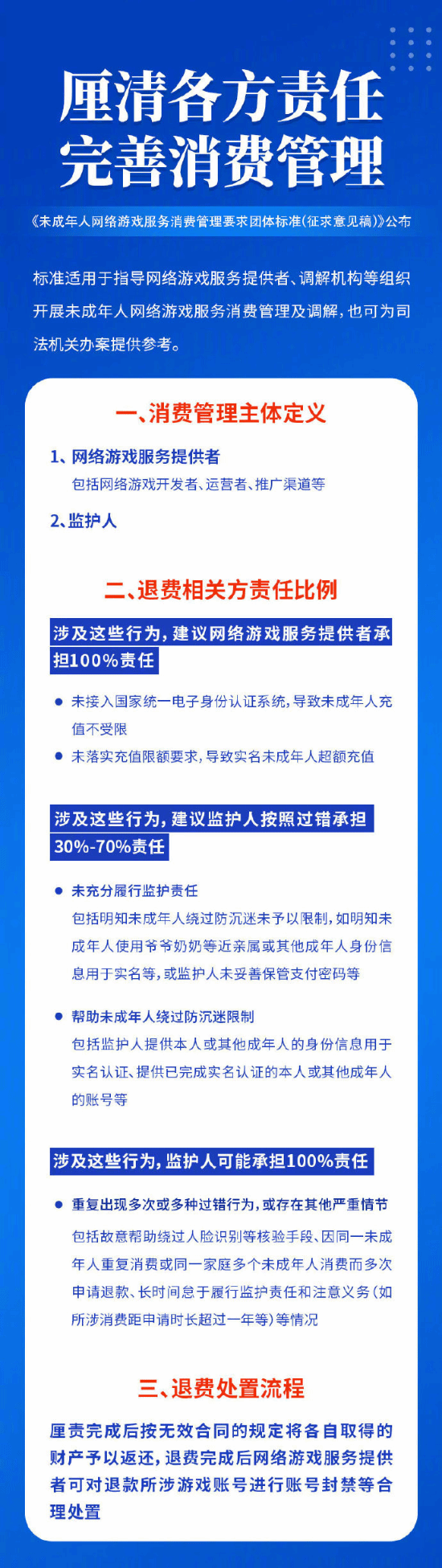 今日,中国互联网协会出台《未成年人网络游戏服务管理要求团体标准(征求意见稿)》,首次提出细化退费标准和建议,根据各方过错情形,明确划分了网络游戏服务提供者、监护人等责任方的担责比例。