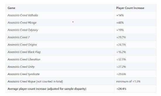 统计数据,去年新作《刺客信条:幻景》的增幅最大,为46%,其次是《刺客信条:解放》,为32.1%。最低的是《刺客信条:叛变》和《刺客信条:英灵殿》。