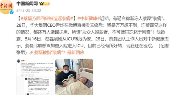 他透露,5月16日,蔡磊刚刚从ICU转危为安。28日,蔡磊团队工作人员对中新健康表示,蔡磊此前感冒加重入院进入ICU,目前已经有所好转,现在还在医院。