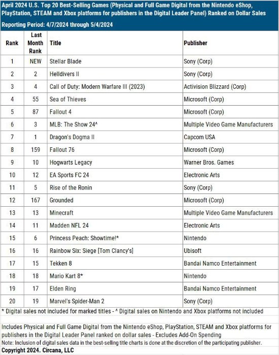 据数据机构Circana(NPD)执行董事Mat Piscatella公布的数据,《剑星》是4月份整个美国最畅销的游戏,位列第一!