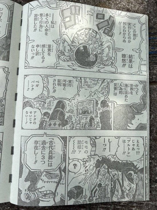 本话紧接着上一话,出现了世界各地的人们对贝加庞克话的反应。人们在问那场800年前的战争的情况。人们问道:“800年前的战争还在继续!?在哪啊!?但是那个时代的人都已经不在人世了!! 为什么一场无人知晓的战争还在继续!?贝加庞克!!”