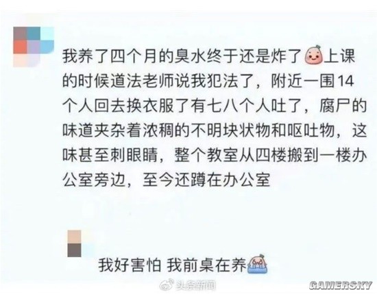 一位曾经有过“养臭水”经历的小学五年级学生说,他从网上看到一个养臭水的配方,和好朋友俩人照单制作,用绳子拴住瓶子藏在教室窗户外面。按照网上分享的经验推算,在快到要炸开的时候,拿到校园花坛去,结果路上炸了,不仅溅了俩人一身臭水,还弄到嘴里去了,俩人当场呕吐不止。