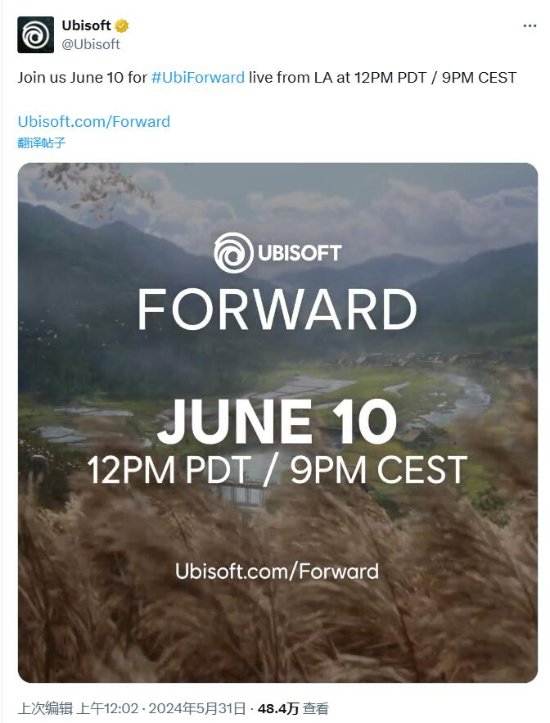 5月31日消息,育碧官方宣布,2024年“Ubisoft Forward”游戏展示会即将于北京时间6月11日凌晨3点举行。