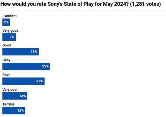人们对这一届的期望值很高。索尼旗下外媒Pushsquare发表了满意度调查,“你如何评价索尼的这次发布会?”并邀请玩家投票。投票共收录1281条有效票数,其中占比最高的为“Okey(还行)”,比例达到25%,其次为“Poor(不太行)”,比例达到22%。综合来看,负面评价远超正面评价,占比达到47%。